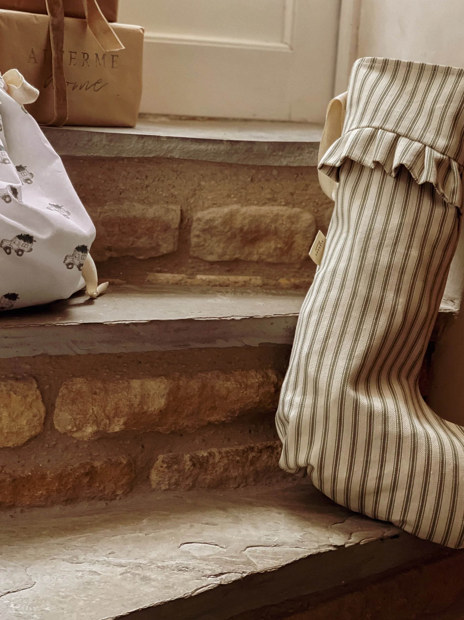 Decorative handmade linen stocking - Jasmine Sage Stripe Ruffle Trim